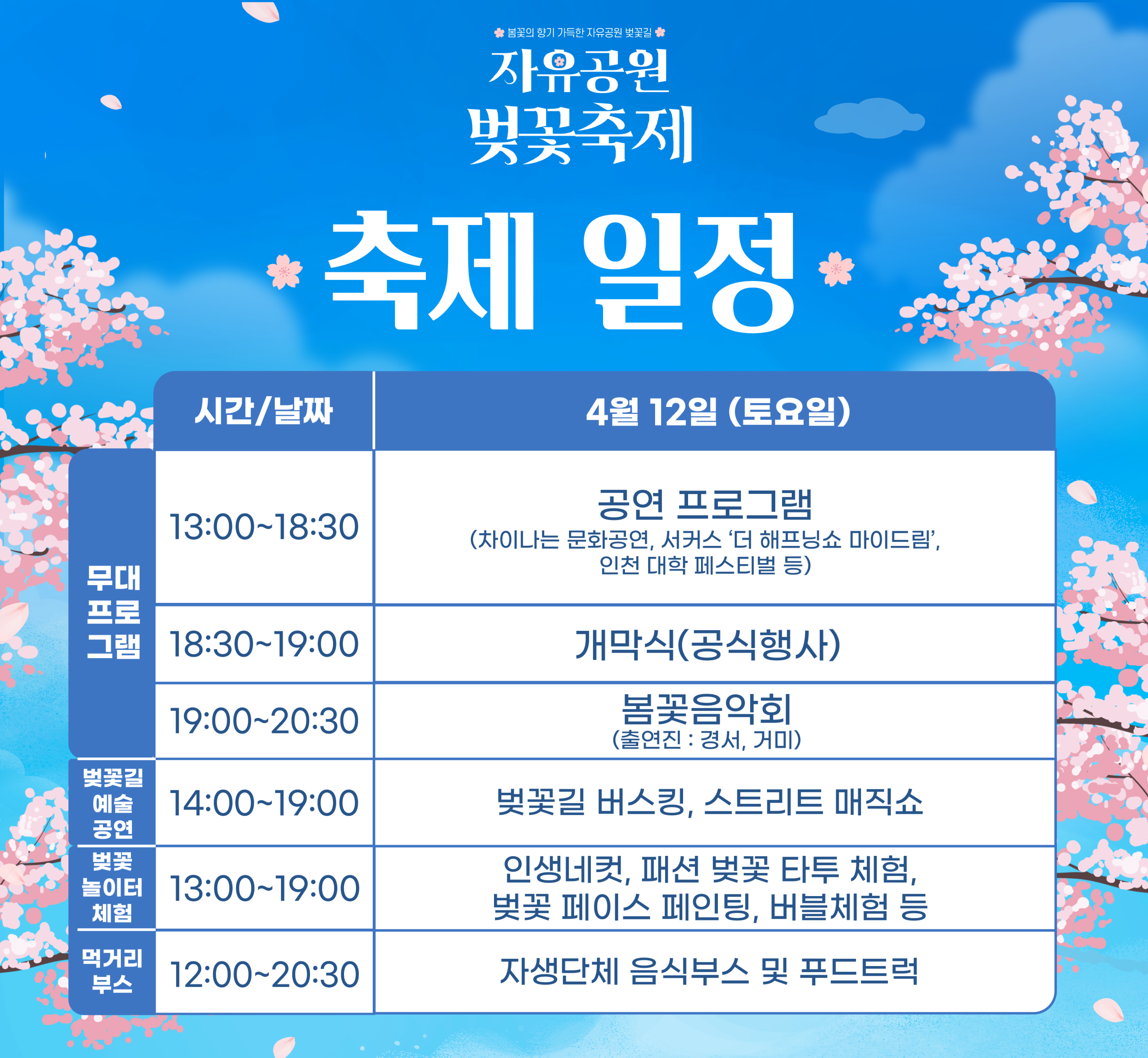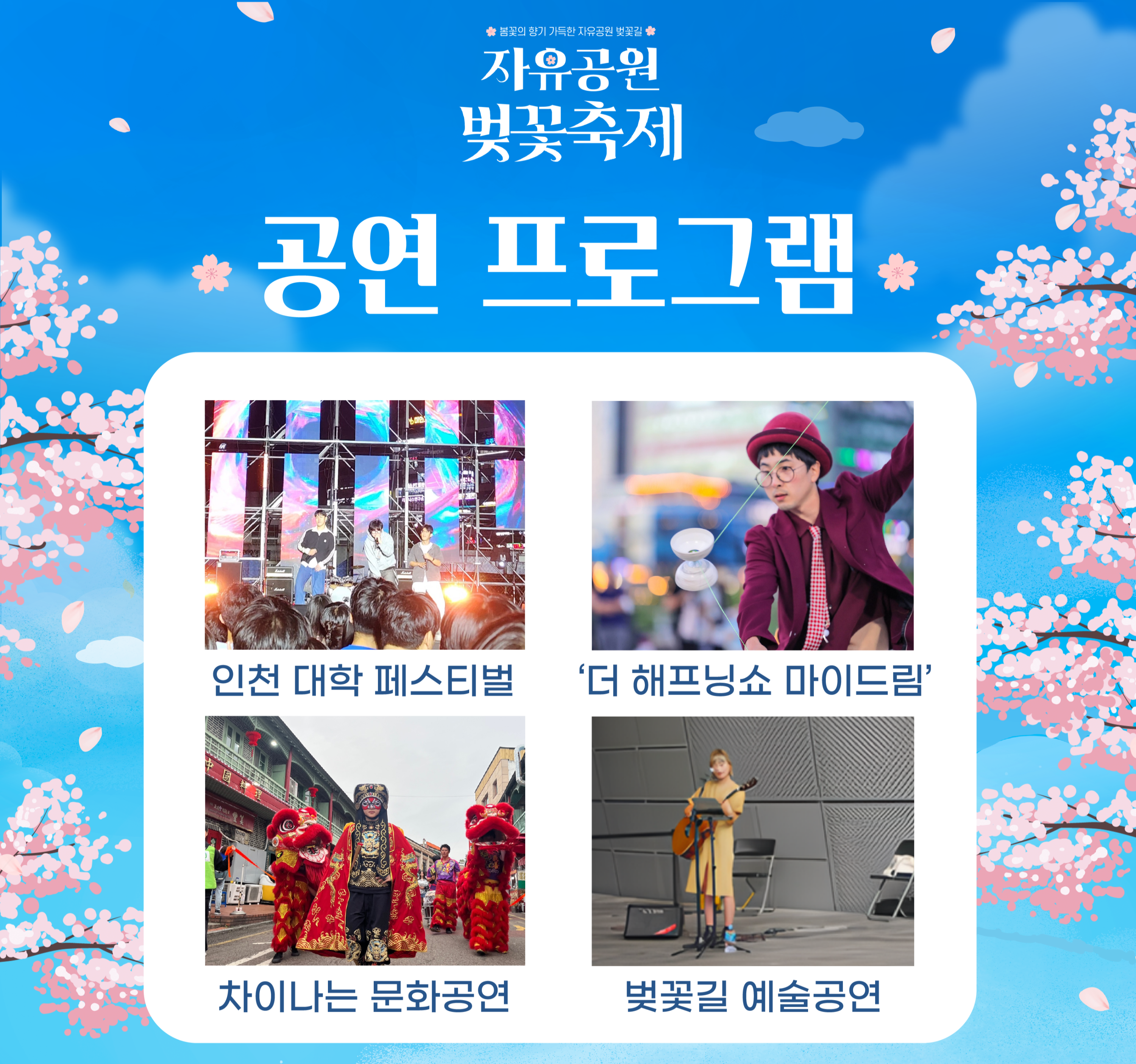 - 내용: 벚꽃길 따라 이어지는 다양한 먹거리 존. 인천 특색 간식과 트렌디한 푸드까지 골고루 준비돼요.