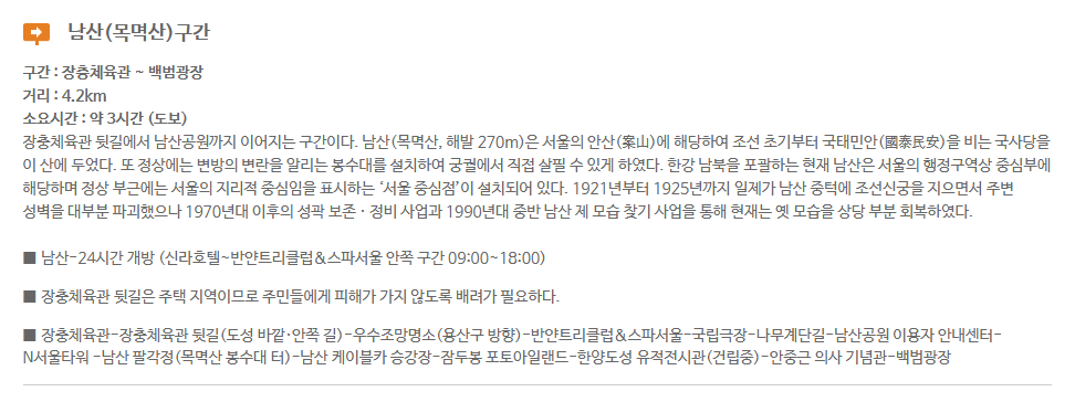 | 3코스 남산구간 | 광희문 ~ 숭례문 | 장충단공원, 남산타워 | 약 5.0km |