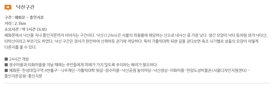 | 2코스 낙산구간 | 혜화문 ~ 광희문 | 낙산공원, 이화마을 | 약 2.1km |