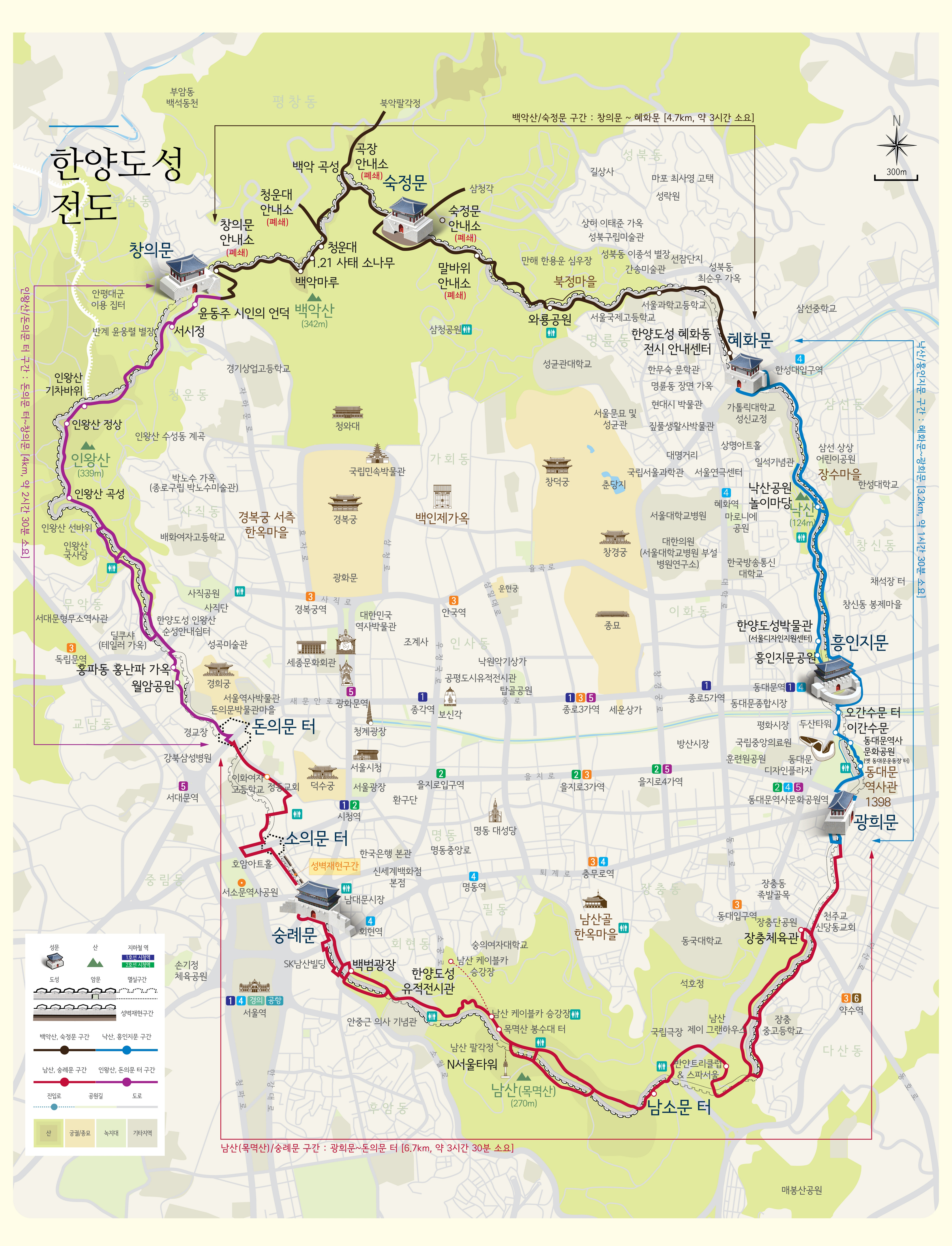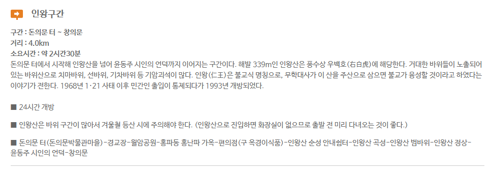 | 4코스 인왕산구간 | 숭례문 ~ 창의문 | 돈의문박물관마을, 인왕산 자락길 | 약 6.8km |