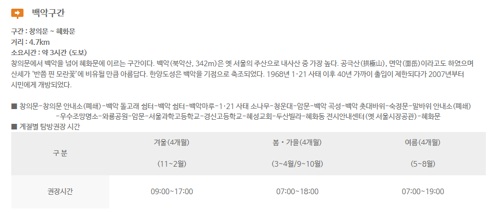 | 1코스 백악구간 | 창의문 ~ 혜화문 | 숙정문, 말바위 안내소 | 약 4.7km |