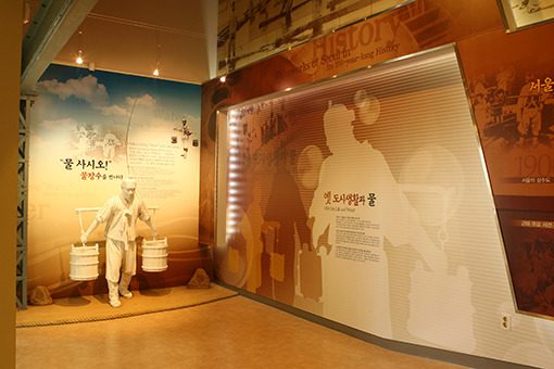 과거 수돗물 공급 시스템, 실제 사용됐던 상수도 장비 전시 등 서울 수돗물 100년 역사를 생생하게 경험할 수 있어요. 물장수 모형도 전시되어 있어요!