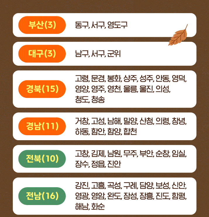 예를 들어 강원, 전남, 경북 등 지방 중소도시 대부분이 포함되어 있고, 이 지역으로 여행하면 단순한 나들이를 넘어 지역경제에도 도움이 되는 착한 소비가 됩니다.
