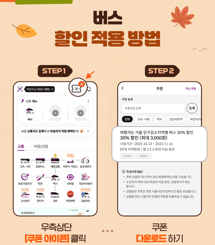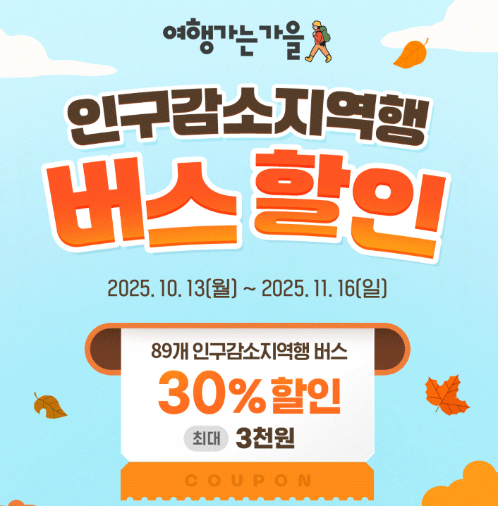 이번 가을 버스 할인은 2025년 10월 13일(월)부터 11월 16일(일)까지 약 한 달 동안 진행됩니다. 해당 기간 동안 인구감소지역으로 향하는 고속·시외버스 요금이 30% 할인되며, 할인 한도는 최대 3,000원이에요. 이번 행사는 문화체육관광부 × 한국관광공사 × 티머니GO가 함께 기획한 전국 단위 교통비 절감 캠페인입니다.