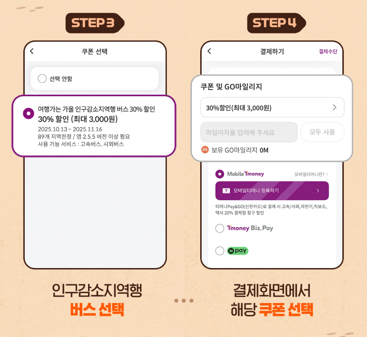 - 버스 예매 시 해당 쿠폰을 적용하고, 할인 대상 노선을 선택합니다.