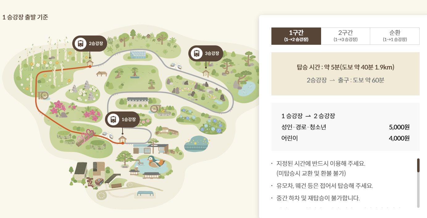 - 운행시간: 오전 9시 30분 ~ 오후 5시 (시즌별 상이)